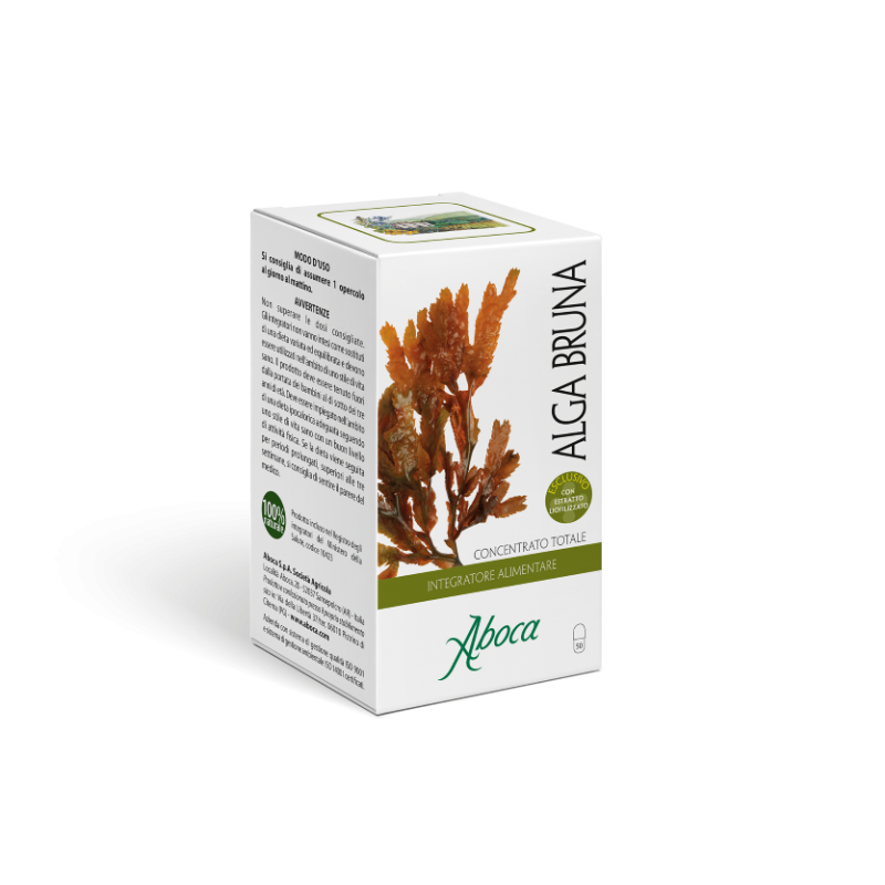 Il Concentrato Totale di Alga Bruna concentra tutte le sostanze funzionali naturalmente presenti nel tallo di questa alga marina nota per la capacità di coadiuvare il controllo del peso corporeo nell’ambito di regimi dietetici controllati e per la stimolazione del metabolismo. Per garantire tutto il complesso delle sostanze funzionali, il settore Ricerca e Sviluppo Aboca ha messo a punto un esclusivo processo tecnologico che permette di combinare l’Estratto Liofilizzato con il Fitocomplesso Totale al fine di garantire: