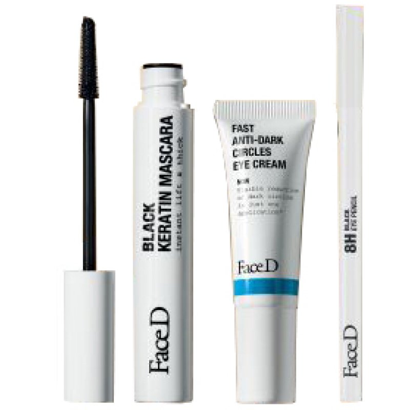 Kit contenente black keratin mascara (10 ml), fast anti-dark circles eye cream (7 ml), 8 h black eye pencil (1,1 g) e padded pouch.