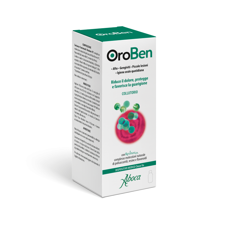 OroBen Collutorio agisce grazie a Resinox FP un complesso molecolare naturale frutto della Ricerca Aboca, composto da polisaccaridi, resine e flavonoidi che creano sulla mucosa una barriera attiva dalla duplice azione: