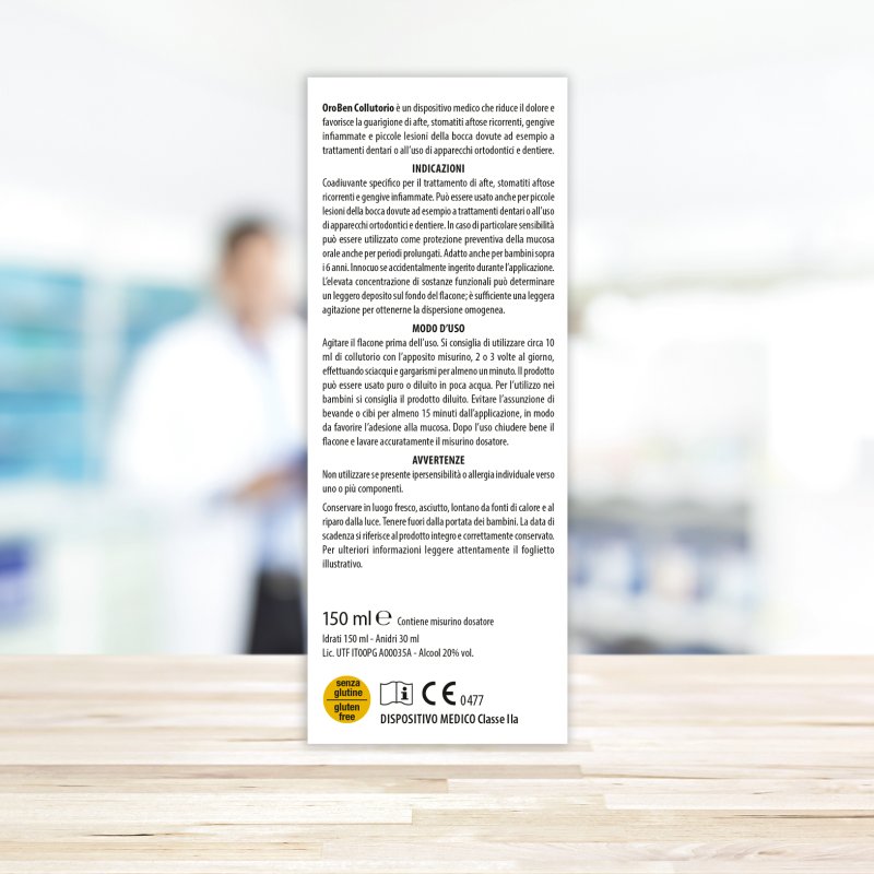 -Antiossidante: protegge la mucosa dall'azione irritante dei radicali liberi. Grazie a questi meccanismi, il prodotto svolge un'azione antinfiammatoria indiretta e favorisce la riparazione tissutale riducendo i tempi di guarigione. Inoltre l'olio essenziale di menta, esplica un'azione rinfrescante lasciando in bocca una piacevole sensazione di freschezza, utile anche a ridurre l'alitosi che spesso accompagna le gengiviti. OroBen Collutorio permette di raggiungere ogni parte del cavo orale, mediante sciacqui e gargarismi, consente la rimozione di agenti irritanti e favorisce quindi il controllo del microambiente, l'igiene e la protezione della bocca. Non contiene conservanti.