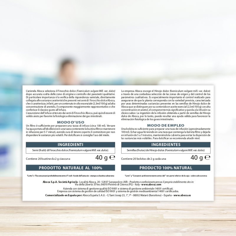 I semi di Finocchio dolce Aboca si caratterizzano per il loro contenuto in olio essenziale (2,5 ml/100 g) ad alta concentrazione di anetolo. È questo il componente maggiormente rappresentativo e responsabile dell’attività aromatica e delle ben note proprietà benefiche di questa pianta officinale che favorisce la fisiologica eliminazione dei gas.