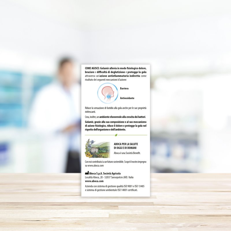 Golamir 2Act calma il dolore e l'irritazione proteggendo la mucosa orofaringea.