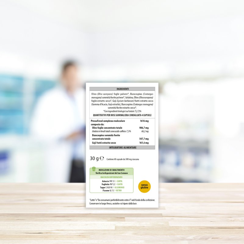 4 capsule contengono: Olivo foglie concentrato totale 960 mg titolato in oleuropeina 9,6% 92,2 mg; Biancospino sommità fiorite concentrato totale 656 mg titolato in flavonoidi totali espressi come iperoside 3,1% 20,3 mg.