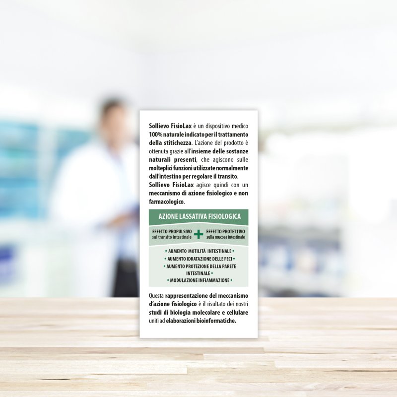 Sollievo FisioLax è un dispositivo medico 100% naturale indicato per il trattamento della stitichezza. L’azione del prodotto è ottenuta grazie all’insieme delle sostanze naturali presenti, che agiscono sulle molteplici funzioni utilizzate normalmente dall’intestino per regolare il transito. Sollievo FisioLax agisce quindi con un meccanismo di azione fisiologico e non farmacologico.
