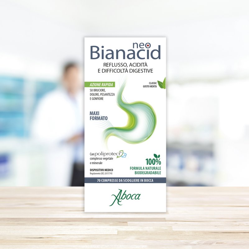 NeoBianacid è un dispositivo medico a base di complessi molecolari vegetali e minerali, che svolge un'azione protettiva e lenitiva della mucosa gastroesofagea utile per contrastare rapidamente il bruciore, il dolore, la sensazione di acidità, ovvero i sintomi tipici dell'irritazione e dell'infiammazione della mucosa stessa. NeoBianacid è un prodotto 100% naturale, biologico, senza glutine e dal gusto gradevole.