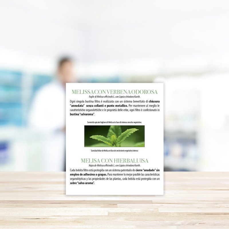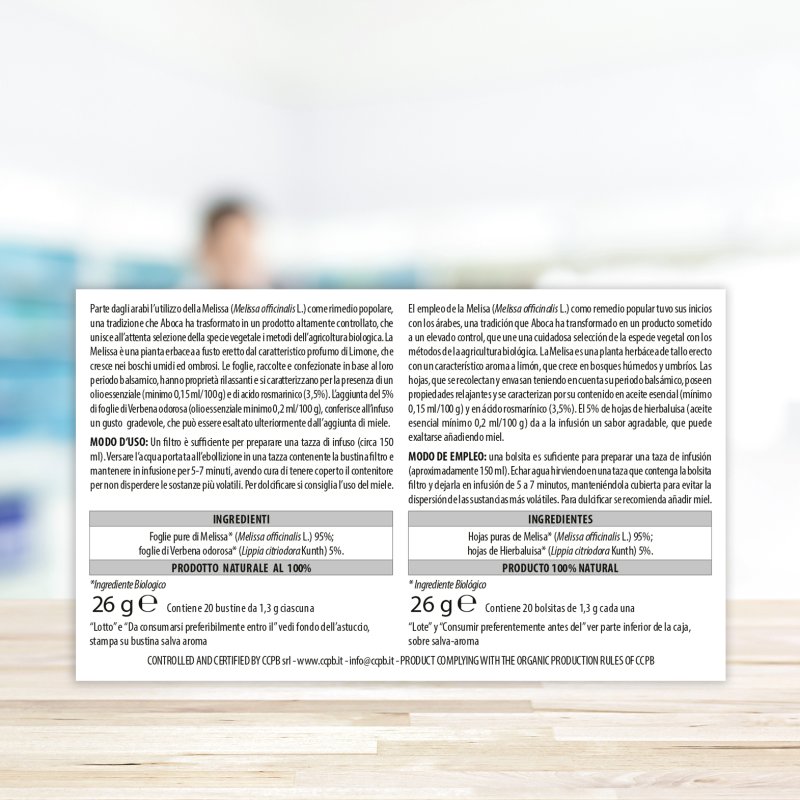 Foglie di melissa (Melissa officinalis) proveniente da agricoltura biologica 95%; foglie di verbena odorosa (Lippia citriodora Kunth) 5%.