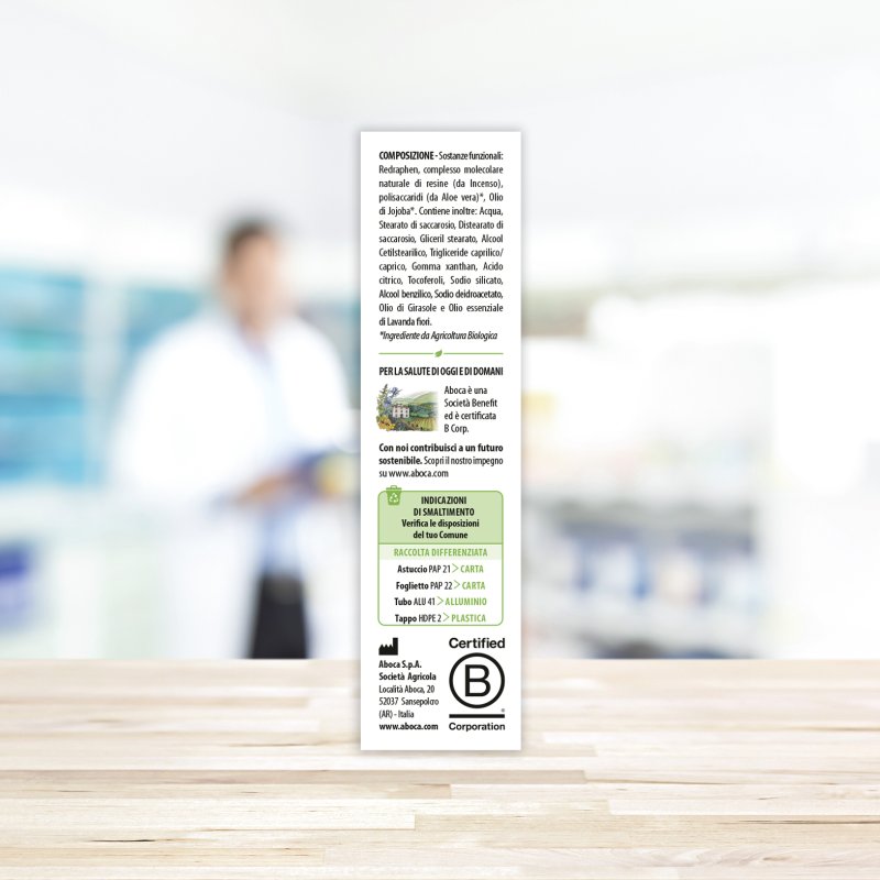 Sostanze funzionali: Redraphen, complesso molecolare naturale di resine (da Incenso), polisaccaridi (da Aloe vera)*, Olio di Jojoba*. Contiene inoltre: acqua, stearato di saccarosio, distearato di saccarosio, gliceril stearato, alcool cetilstearilico, trigliceride caprilico/caprico, gomma xanthan, acido citrico, tocoferoli, sodio silicato, alcool benzilico, sodio deidroacetato, olio di Girasole e olio essenziale di Lavanda fiori.
