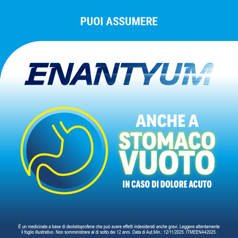 Posologia Adulti In base alla natura e all’intensità del dolore, la dose raccomandata è in genere di 12.5 mg ogni 4-6 ore o di 25 mg ogni 8 ore. La dose giornaliera totale non deve superare i 75 mg. Gli effetti indesiderati possono essere minimizzati con l’uso della più bassa dose efficace per la più breve durata possibile di trattamento che occorre per controllare i sintomi (vedere paragrafo 4.4). Enantyum compresse non è indicato nei trattamenti a lungo termine e la somministrazione va limitata al solo periodo sintomatico. Anziani Nel paziente anziano si raccomanda di iniziare la terapia al limite inferiore del range di dosaggio (50 mg di dose giornaliera totale). Il dosaggio può essere aumentato in modo da raggiungere quello impiegato per la popolazione generale solo dopo che sia stata accertata una buona tollerabilità generale. Insufficienza epatica I pazienti con insufficienza epatica da lieve a moderata devono iniziare la terapia a dosi ridotte (50 mg di dose giornaliera totale) e devono essere sottoposti a stretto controllo medico. Enantyum compresse non deve essere usato in pazienti con insufficienza epatica grave. Insufficienza renale Nei pazienti con danno renale lieve (clearance della creatinina 60 - 89 ml/min), il dosaggio iniziale deve essere ridotto a 50 mg di dose giornaliera totale (vedere paragrafo 4.4). Enantyum compresse non deve essere usato in pazienti con danno renale da moderato a severo (clearance della creatinina ≤ 59 ml/min) (vedere paragrafo 4.3). Popolazione pediatrica Enantyum compresse non è stato studiato nei bambini e negli adolescenti. Pertanto, la sicurezza e l’efficacia non sono state stabilite ed il prodotto non deve essere usato nei bambini e negli adolescenti. Modo di somministrazione La compressa deve essere deglutita con una sufficiente quantità di liquido (ad esempio un bicchiere di acqua). La concomitante somministrazione di cibo ritarda la velocità di assorbimento del farmaco (vedere paragrafo “Proprietà Farmacocinetiche”), pertanto in caso di dolore acuto si raccomanda che la somministrazione avvenga almeno 30 minuti prima dei pasti.