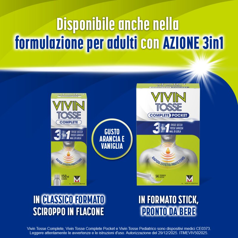 Dispositivo medico a base di piantaggine, altea e miele, in grado di creare un film protettivo che calma la tosse proteggendo le prime vie aeree. Grazie alla presenza di estratti vegetali di dimostrata efficacia Vivin Tosse Pediatrico agisce creando una barriera protettiva che limita il contatto delle vie respiratorie con gli agenti esterni ad azione irritante, migliorando la funzionalità delle prime vie respiratorie, soprattutto nei periodi invernali, o quando fenomeni irritativi dovuti ad agenti esterni (freddo, smog, polvere e fumo), lo rendono necessario.