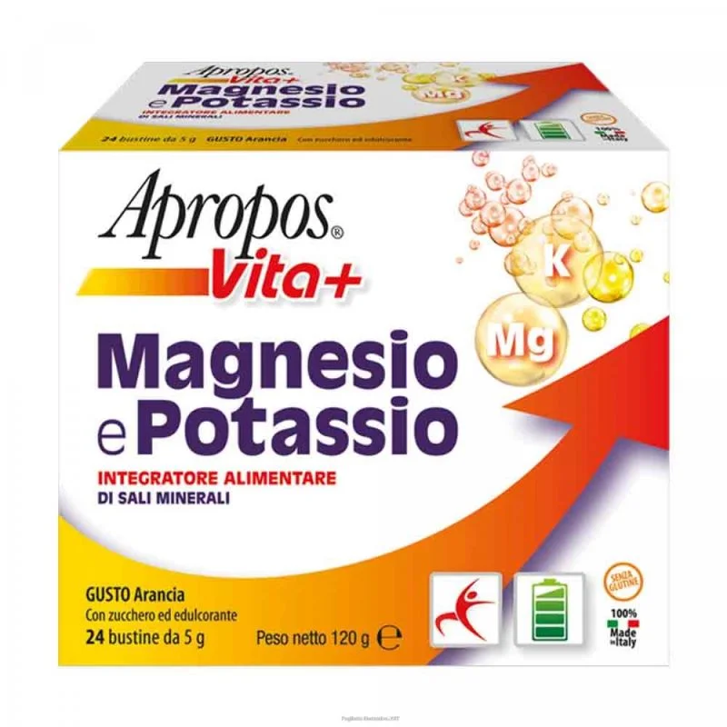 Apropos Vita+ Magnesio e Potassio è un integratore alimentare a base di sali minerali utili in caso di carenze alimentari o di aumentato fabbisogno di tali nutrienti.