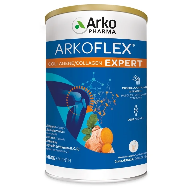 Integratore alimentare in polvere a base di collagene idrolizzato tipo II nativo, acido ialuronico, magnesio, manganese, curcuma e vitamine C, B1, B2, B6, B12 e D. Con edulcoranti.