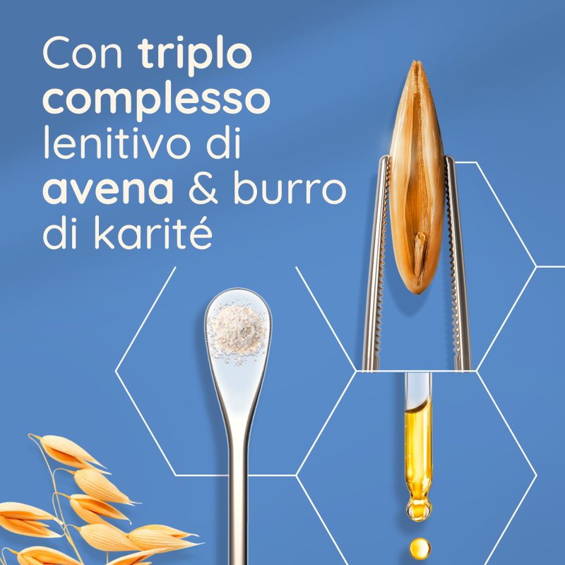 Infatti, grazie alla sua formula lenitiva con un triplo complesso all’avena prebiotica (farina d’avena + estratto d’avena + olio d’avena) aiuta a migliorare l’equilibrio del microbioma naturale della pelle rendendo la pelle più elastica e sana sin dalle prime applicazioni.