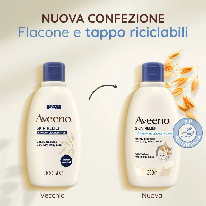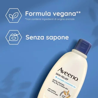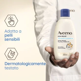 Aveeno Skin Relief Olio Bagno Doccia è un bagnoschiuma oleoso ideale da utilizzare in caso di pelle secca, molto secca e sensibile grazie alla presenza di un triplo complesso all'avena prebiotica, capace di ripristinare la barriera cutanea.