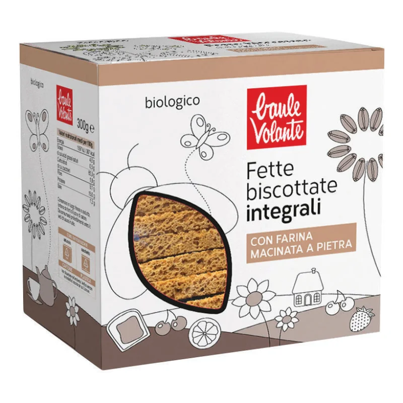Fette biscottate integrali biologiche preparate con farine macinate a pietra, per conservare tutto il sapore e le proprietà nutritive del chicco di grano e lievitate lentamente con pasta madre. Con olio extravergine di oliva e senza olio di palma.