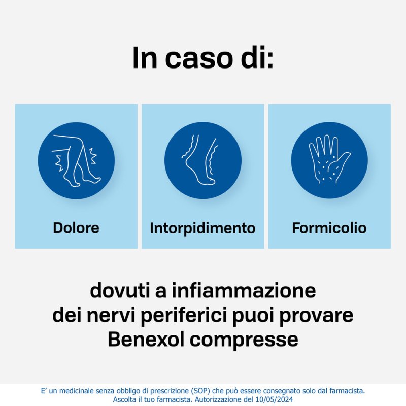 Benexol è indicato negli adulti e negli adolescenti a partire dai 12 anni di età Posologia Benexol compresse gastroresistenti 1 compressa al giorno. Il prodotto è generalmente prescritto per periodi di una o più settimane. In qualche caso, il medico può prolungare il trattamento fino ad alcuni mesi. Benexol dosaggio basso polvere e solvente Benexol dosaggio basso è indicato quando l’assorbimento è marcatamente ridotto e per il trattamento delle ipovitaminosi. La dose è di una fiala al giorno, salvo diversa prescrizione medica. Benexol dosaggio alto polvere e solvente Benexol dosaggio alto è indicato per la terapia iniziale di forme con sintomatologia particolarmente intensa. La dose è di una fiala al giorno, salvo diversa prescrizione medica.Metodo di somministrazione: Benexol compresse gastroresistenti Le compresse di Benexol vanno inghiottite con un sorso di liquido, senza masticarle nè scioglierle preventivamente. Benexol dosaggio basso polvere e solvente L’iniezione va fatta per via intramuscolare profonda da personale qualificato ed esperto e la somministrazione deve avvenire il più lentamente possibile. La soluzione da iniettare si prepara al momento, sciogliendo la sostanza secca liofilizzata con l’apposito solvente contenuto nella confezione. Benexol dosaggio alto polvere e solvente L’iniezione va fatta per via intramuscolare profonda da personale qualificato ed esperto e la somministrazione deve avvenire il più lentamente possibile. La soluzione da iniettare si prepara al momento, sciogliendo la sostanza secca liofilizzata con l’apposito solvente contenuto nella confezione.