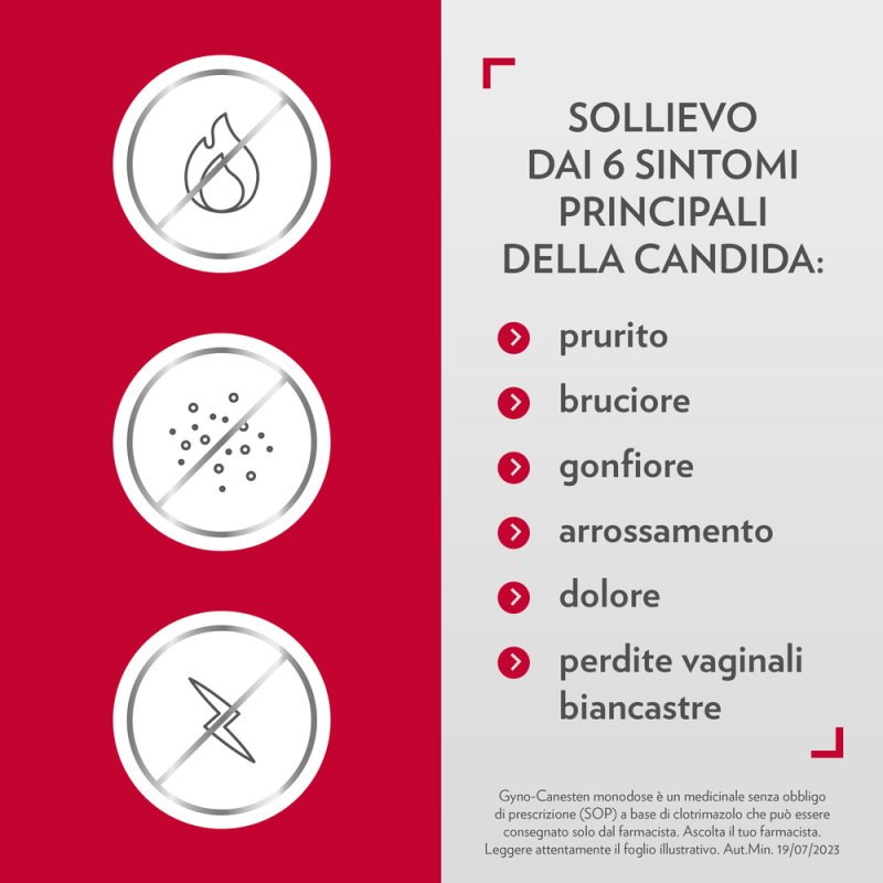 Posologia Adulti e adolescenti dai 16 anni in su Una capsula molle vaginale inserita in profondità nella vagina come dose singola la sera. Se non ci sono miglioramenti dopo 7 giorni, la paziente deve consultare un medico. Adolescenti di 12-15 anni di età Negli adolescenti sotto i 16 anni, Gyno-Canesten monodose capsula molle vaginale deve essere utilizzato solo dopo aver consultato il medico. Se prescritto in questa popolazione (in pazienti post-menarca), la posologia raccomandata è la stessa degli adulti. Popolazione pediatrica La sicurezza e l’efficacia nelle bambine di età inferiore a 12 anni non sono state stabilite. Modo di somministrazione Una capsula molle vaginale inserita in profondità nella vagina come dose singola la sera. La capsula molle vaginale va inserita il più profondamente possibile nella vagina con l’applicatore incluso nella confezione. Durante la gravidanza si deve inserire con un dito la capsula molle vaginale nella vagina, senza l’applicatore, per evitare lesioni a carico della cervice uterina. Il trattamento con Gyno-Canesten monodose 500 mg capsula molle vaginale non va effettuato durante il periodo mestruale. Il trattamento deve essere terminato prima dell’inizio delle mestruazioni. Il partner deve sottoporsi a un trattamento locale se presenta sintomi come prurito, infiammazione.