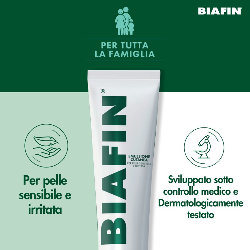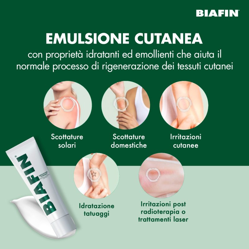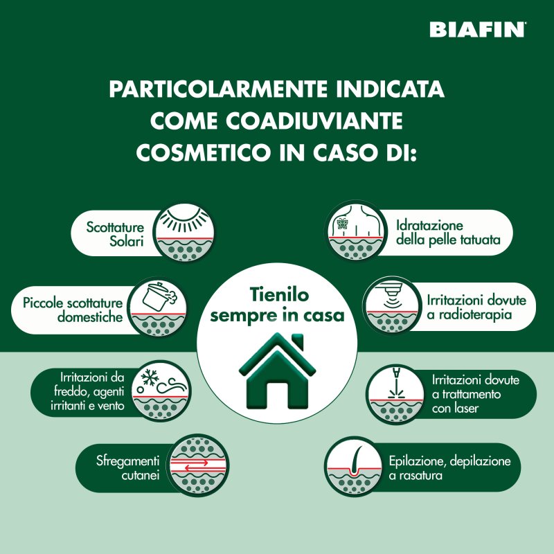 Biafin è una emulsione idratante particolarmente indicata come coadiuvante cosmetico in caso di scottature e di problemi cutanei legati all'esposizione a radiazioni (ad esempio, solari).