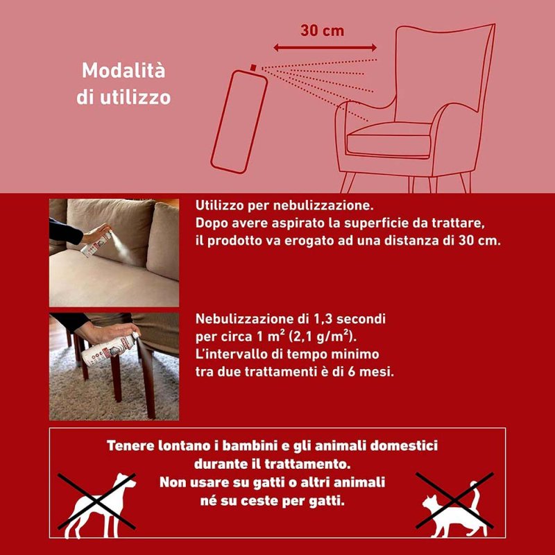 Arricchito con Permetrina e S-metoprene, elimina pulci adulte, larve di pulci e zecche e può essere applicato su mobili non lavabili e tessili per la casa, come tappeti, stuoie, poltrone, cucce, interni auto, etc.