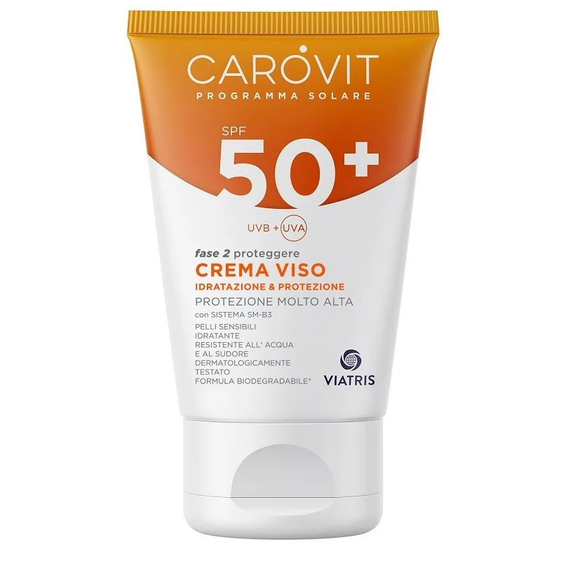 Carovit Solare Crema Viso SPF50+ è una protezione solare molto alta formulata per proteggere viso, collo e mani dai danni causati dall'esposizione ai raggi solari.