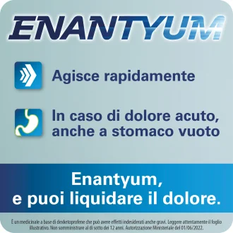 Posologia Adulti In base alla natura e all’intensità del dolore, la dose raccomandata è in genere di 12.5 mg ogni 4-6 ore o di 25 mg ogni 8 ore. La dose giornaliera totale non deve superare i 75 mg. Gli effetti indesiderati possono essere minimizzati con l’uso della più bassa dose efficace per la più breve durata possibile di trattamento che occorre per controllare i sintomi (vedere paragrafo 4.4). Enantyum compresse non è indicato nei trattamenti a lungo termine e la somministrazione va limitata al solo periodo sintomatico. Anziani Nel paziente anziano si raccomanda di iniziare la terapia al limite inferiore del range di dosaggio (50 mg di dose giornaliera totale). Il dosaggio può essere aumentato in modo da raggiungere quello impiegato per la popolazione generale solo dopo che sia stata accertata una buona tollerabilità generale. Insufficienza epatica I pazienti con insufficienza epatica da lieve a moderata devono iniziare la terapia a dosi ridotte (50 mg di dose giornaliera totale) e devono essere sottoposti a stretto controllo medico. Enantyum compresse non deve essere usato in pazienti con insufficienza epatica grave. Insufficienza renale Nei pazienti con danno renale lieve (clearance della creatinina 60 - 89 ml/min), il dosaggio iniziale deve essere ridotto a 50 mg di dose giornaliera totale (vedere paragrafo 4.4). Enantyum compresse non deve essere usato in pazienti con danno renale da moderato a severo (clearance della creatinina ≤ 59 ml/min) (vedere paragrafo 4.3). Popolazione pediatrica Enantyum compresse non è stato studiato nei bambini e negli adolescenti. Pertanto, la sicurezza e l’efficacia non sono state stabilite ed il prodotto non deve essere usato nei bambini e negli adolescenti. Modo di somministrazione La compressa deve essere deglutita con una sufficiente quantità di liquido (ad esempio un bicchiere di acqua). La concomitante somministrazione di cibo ritarda la velocità di assorbimento del farmaco (vedere paragrafo “Proprietà Farmacocinetiche”), pertanto in caso di dolore acuto si raccomanda che la somministrazione avvenga almeno 30 minuti prima dei pasti.