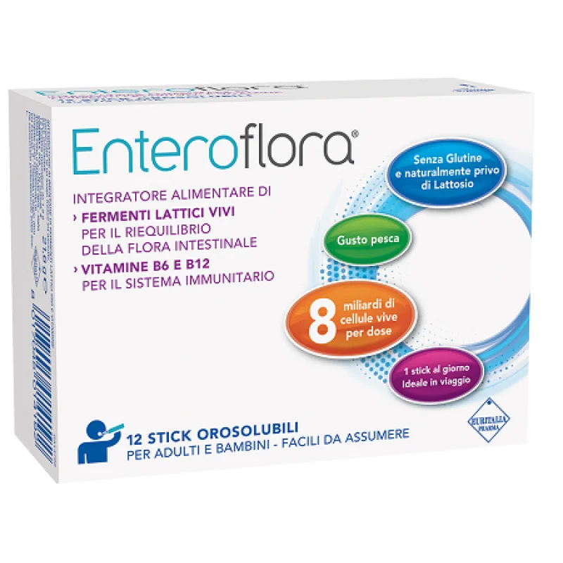 Integratore alimentare di fermenti lattici vivi, per il riequilibrio della flora intestinale, e vitamine B6 e B12, per il sistema immunitario. Gusto pesca.