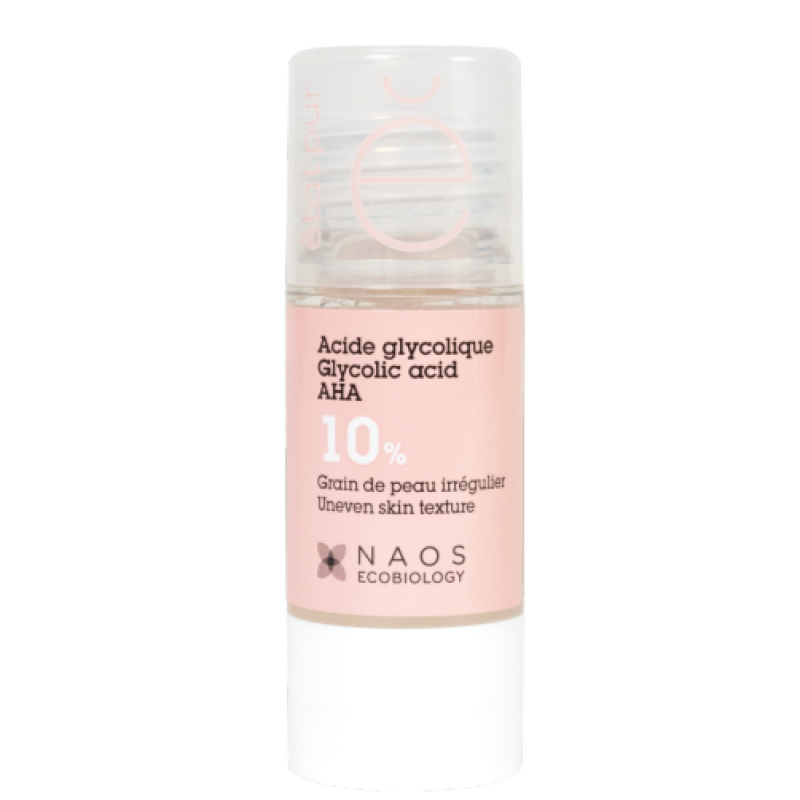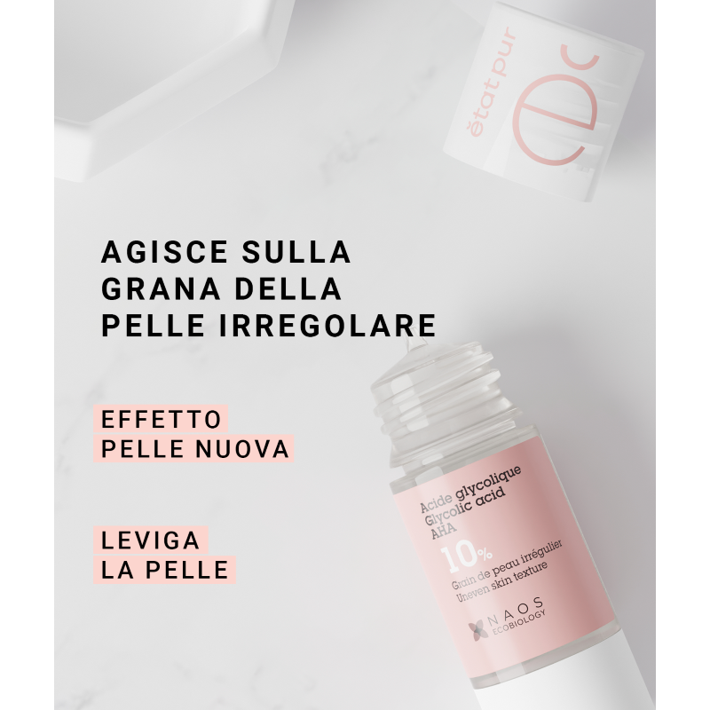 Etat Pur Acido Glicolico AHA 10% è l'attivo puro a base di Acido Glicolico realizzato per migliorare l'iperpigmentazione e la grana irregolare della pelle.