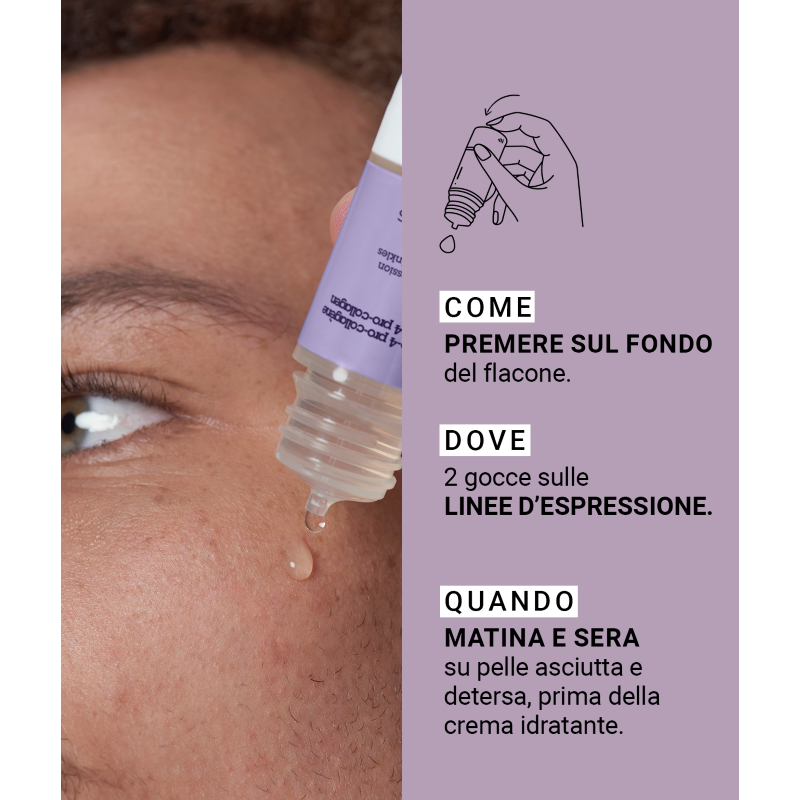 Premere la base del flacone e applicare 2 gocce direttamente sulla pelle del viso, su ciascuna zona interessata, quindi fronte, contorno occhi e area peri-labiale.