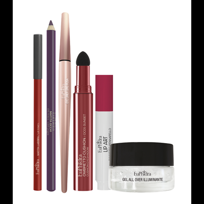 Euphidra Cofanetto di Natale Una Grande Storia D'Amore - Lip Art Rossetto + Matita occhi L0O9 prugna + Ombretto cushion + Matita labbra + Illuminante All Over + Eyeliner