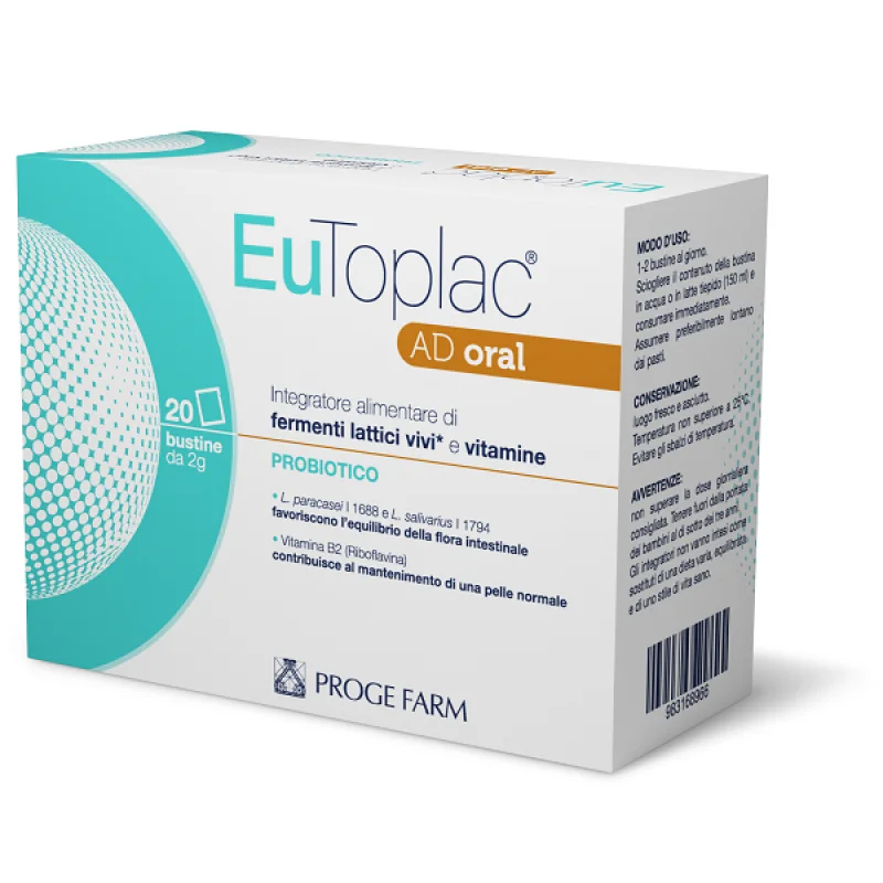 EuToplac AD oral contiene PS MIX, una miscela di probiotici (L. paracasei I 1688 e L. salivarius I 1794), che favorisce l’equilibrio della flora intestinale. La vitamina B2 (riboflavina) contribuisce al mantenimento di una pelle normale.