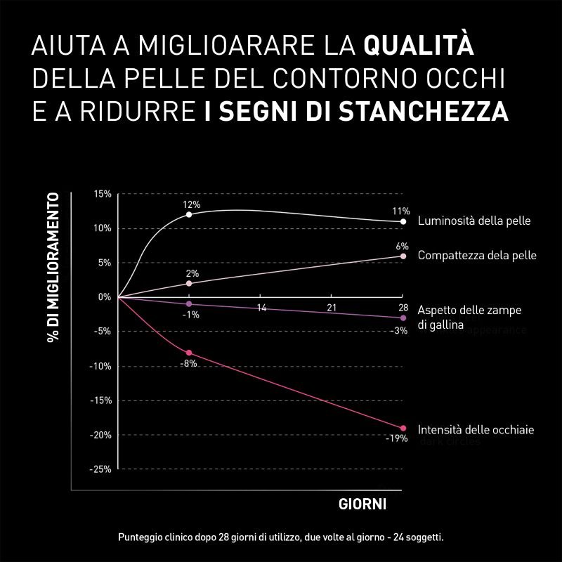 I peptidi e l'acido ialuronico idratano e rimpolpano tutte le rughe del contorno occhi, come le classiche zampe di gallina e la Niacinamide contrasta i segni della stanchezza e la pigmentazione, garantendo uno sguardo defaticato, liscio e ringiovanito.