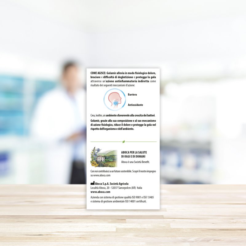 Golamir è un dispositivo medico indicato nei casi di mal di gola per il trattamento degli stati irritativi e infiammatori del cavo orofaringeo, che possono essere causati da virus, batteri, allergeni o dal contatto con agenti esterni irritanti (fumo, smog, polvere). Il prodotto è adatto anche negli stati di raffreddamento dove le secrezioni nasali, scendendo nella gola, possono essere causa di irritazione. Da 1 anno di età.