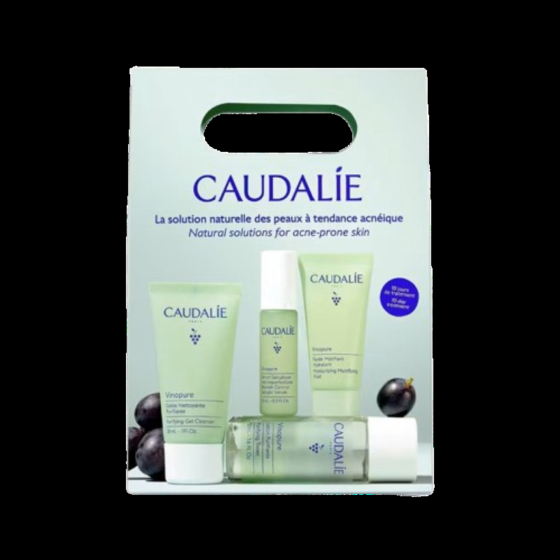 Caudalie Vinopure Starter Kit Cofanetto per Pelle a Tendenza Acneica - Gel detergente + Lozione purificante + Siero anti-imperfezioni + Fluido idratante mat