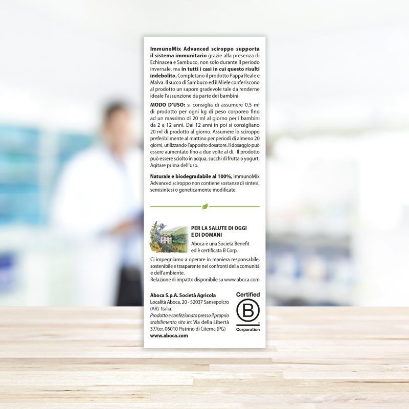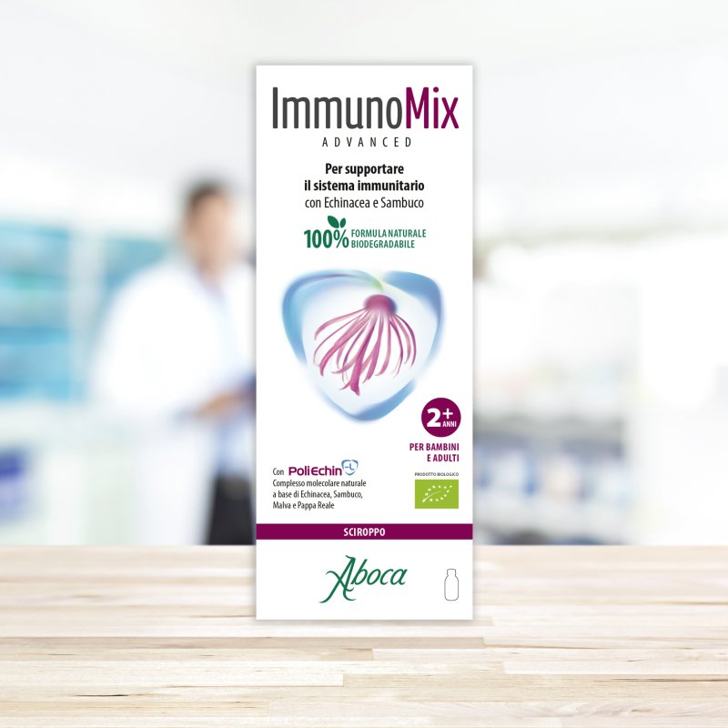 Sciroppo 100% naturale frutto del nostro sistema integrato, unico al mondo, che va dalla coltivazione, alla ricerca fitochimica e biologica. Supporta il sistema immunitario grazie alla presenza di echinacea e sambuco, non solo durante il periodo invernale, ma in tutti i casi in cui questo risulti indebolito. Completano il prodotto pappa reale e malva. Il succo di sambuco ed il miele conferiscono al prodotto un sapore gradevole tale da renderne ideale l’assunzione da parte dei bambini.