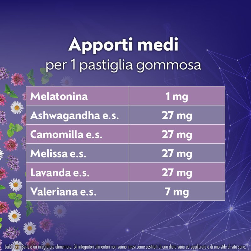 Laila Dormibene contiene: Melatonina, Camomilla, Valeriana, Ashwagandha, Melissa e Lavanda.