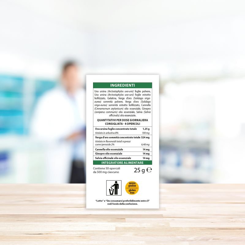 Uva ursina (Arctostaphylos uva-ursi) foglie polvere, uva ursina (Arctostaphylos uva- ursi) foglie estratto liofilizzato, gelatina, verga d'oro (Solidago virga-aurea) sommità polvere, verga d'oro (Solidago virga-aurea) sommità estratto liofilizzato, cannella (Cinnamomum zeylanicum) olio essenziale, ginepro (Juniperus communis) olio essenziale, salvia (Salvia officinalis) olio essenziale.