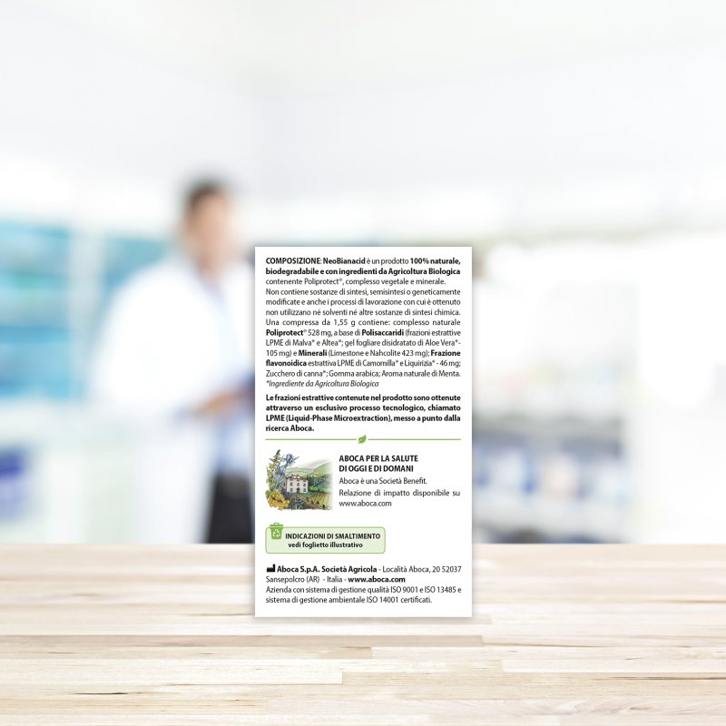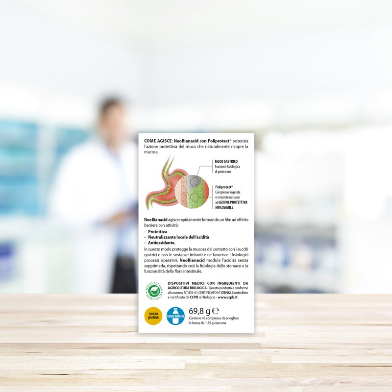 NeoBianacid Acidità e Reflusso è un prodotto a base di complessi molecolari vegetali e minerali, che svolge un'azione protettiva e lenitiva della mucosa gastro-esofagea, utile per contrastare rapidamente il bruciore, il dolore, la sensazione di acidità, ovvero i sintomi tipici dell'irritazione e dell'infiammazione della mucosa stessa.