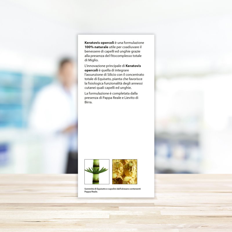 L'innovazione principale di Keratovis opercoli è quella di integrare l'assunzione di silicio con il concentrato totale di equiseto, pianta che favorisce la fisiologica funzionalità degli annessi cutanei quali capelli ed unghie.