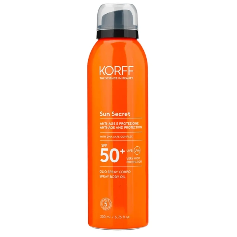 Korff Sun Secret Olio Spray Protettivo Anti-Età SPF50+ è uno spray protettivo leggero dal finish invisibile e dal tocco asciutto.