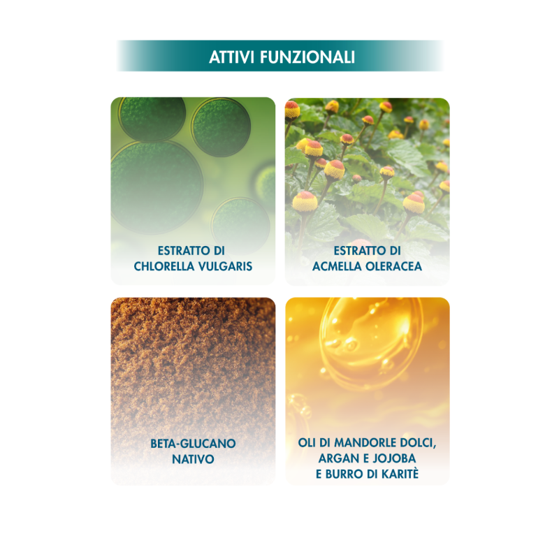 Il beta-glucano nativo aiuta a mantenere l’idratazione cutanea, mentre un blend nutriente di oli di Mandorle dolci, Argan e Jojoba insieme al burro di Karité dona comfort e morbidezza.