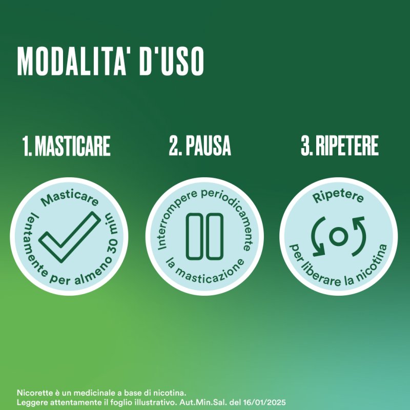Bambini ed adolescenti NICORETTE gomme da masticare non deve essere somministrato a persone di età inferiore a 18 anni senza il parere del medico. Adulti ed anziani Il dosaggio di NICORETTE dipende dalla quantità di sigarette normalmente consumate dal singolo fumatore. E' consigliabile iniziare con la preparazione da 2 mg individuando, secondo necessità la posologia ottimale, il numero di gomme da masticare nel corso della giornata. Nel caso non risultassero sufficienti 15 gomme da 2 mg al giorno, come per esempio in forti fumatori (più di 20 sigarette al giorno) è preferibile l'uso di NICORETTE gomme masticabili da 4 mg, o due gomme da 2 mg contemporaneamente. Masticare una gomma ogni qualvolta si senta il bisogno di fumare. E' importante MASTICARE MOLTO LENTAMENTE PER ALMENO 30 MINUTI per ottenere la liberazione della nicotina. Una masticazione troppo veloce determina l'assorbimento della nicotina in tempi troppo brevi: per evitare questo inconveniente si consiglia di interrompere di tanto in tanto la masticazione. Non utilizzare più di 15 gomme da 4 mg al giorno. La durata consigliata del trattamento è di 3 mesi. Dopo tale periodo si dovrà gradualmente ridurre la dose giornaliera. Quando questa sarà scesa a 1- 2 gomme, si consiglia di provare a interrompere completamente l'uso di NICORETTE. Tuttavia è opportuno tenere a disposizione qualche gomma da masticare di scorta, nel caso di un improvviso ritorno del desiderio di fumare. NICORETTE gomme da masticare risulta maneggevole anche per i soggetti diabetici perché non contiene saccarosio o glucosio. Non è consigliabile protrarre il trattamento oltre i 12 mesi. Attenzione: Non Superare Le Dosi Consigliate. Usare NICORETTE gomme masticabili come indicato sopra, quando si avverte il desiderio di fumare, in modo da mantenere la completa astensione dal fumo. Il numero delle gomme impiegate deve essere sufficiente a coprire il fabbisogno di nicotina. Nella maggior parte dei fumatori sono di norma sufficienti 10 gomme da 2 mg al giorno.