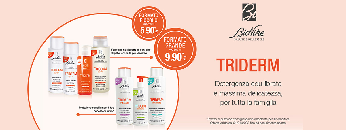 La linea Triderm è l'ideale per la detersione quotidiana e offre un'ampia varietà di prodotti adatti a tutta la famiglia, dalle formulazioni prive di Nickel, senza conservanti e senza glutine.