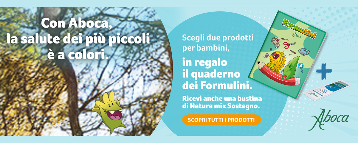 Scegli 2 prodotti della linea bambini Aboca e ricevi subito il quaderno dei Formulini, ricco di giochi, disegni e curiosità per imparare divertendosi e una bustina di Natura Mix Sostegno, per dare un supporto naturale all'energia e alle difese dei più piccoli.