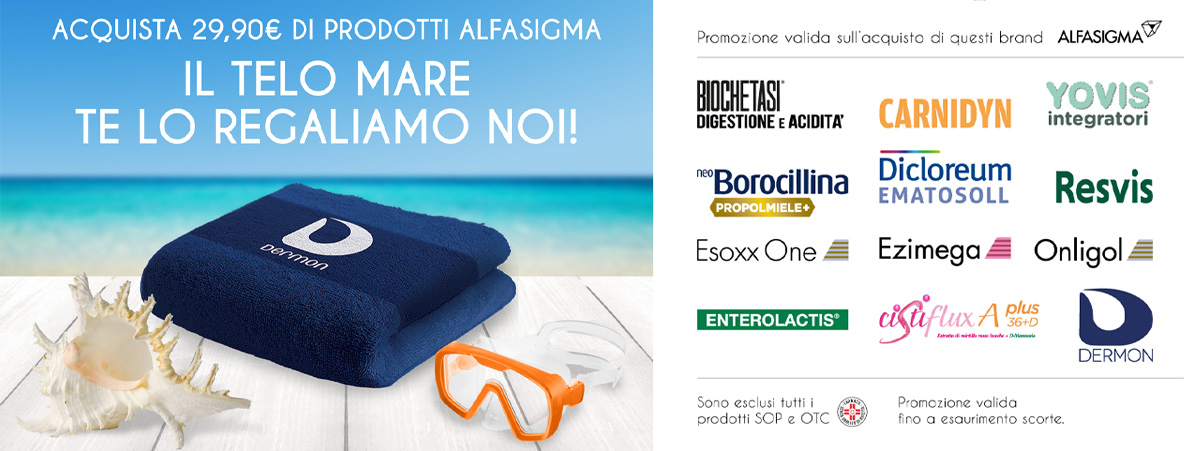 Approfitta della nostra esclusiva promozione: con una spesa minima pari a 29.90€ di prodotti della nostra selezione, ricevi subito in omaggio un fantastico telo mare firmato Dermon!