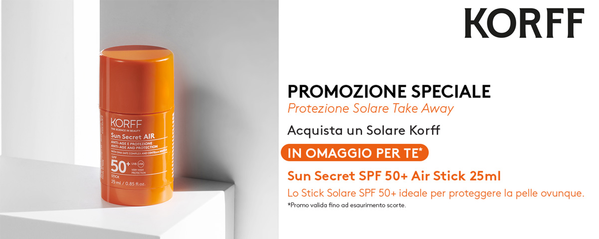 Acquistando uno dei solari Korff Sun Secret, ricevi in omaggio lo Stick SPF 50+ Air 25 ml, il formato compatto ideale da portare sempre con te: perfetto in borsa, in viaggio, al mare o in città, per ritoccare la protezione nei punti più delicati come viso, contorno occhi, labbra, cicatrici e tatuaggi.