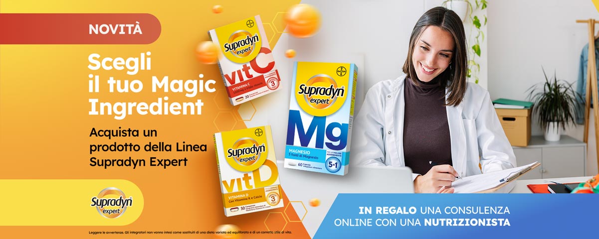 Con la Linea Supradyn Expert puoi scegliere il tuo Magic Ingredient, il nutriente più adatto alle esigenze del tuo stile di vita, e accompagnare corpo e mente nei momenti che contano di più.