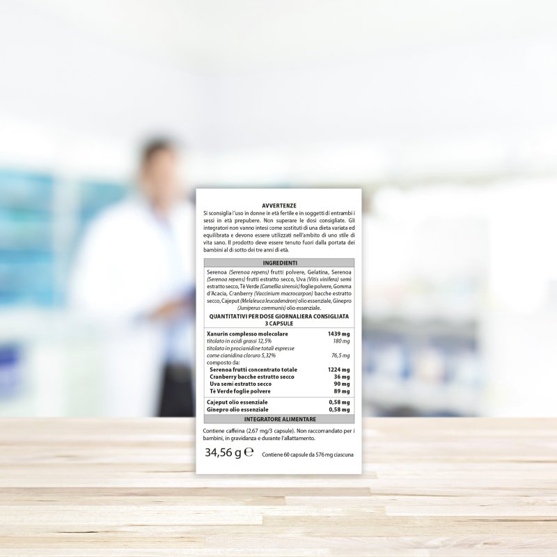 Serenoa (serenoa repens) frutti polvere, gelatina, serenoa (serenoa repens) frutti estratto liofilizzato, uva (vitis vinifera) semi estratto liofilizzato, tè verde (camelia sinensis) foglie polvere, gomma d’acacia, cranberry (vaccinium macrocarpon) bacche estratto secco, cajeput (melaleuca leucadendron) olio essenziale, ginepro (juniperus communis) olio essenziale.
