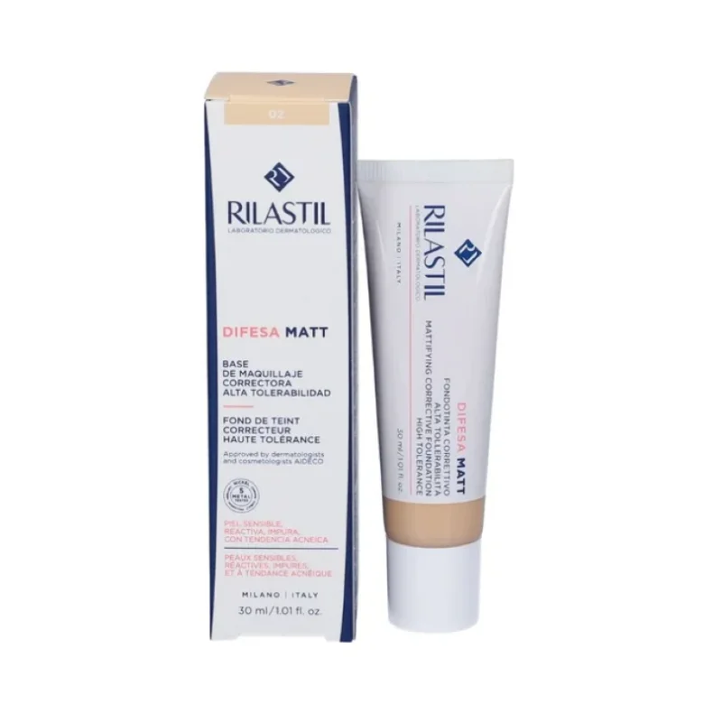 Rilastil Difesa Matt Fondotinta Correttivo 02 è il fondotinta dalla tonalità chiara, specificamente formulato per la pelle impura, grassa e a tendenza acneica.