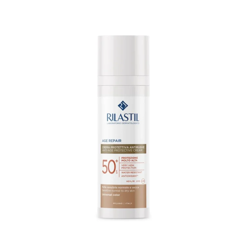 Rilastil Sun System Age Repair Color Crema Antirughe SPF50+ è una crema viso con fattore di protezione solare molto alta SPF50+ che sfrutta la presenza di Agerepair Complex per proteggere la pelle dal fotoinvecchiamento causato dai raggi solari.