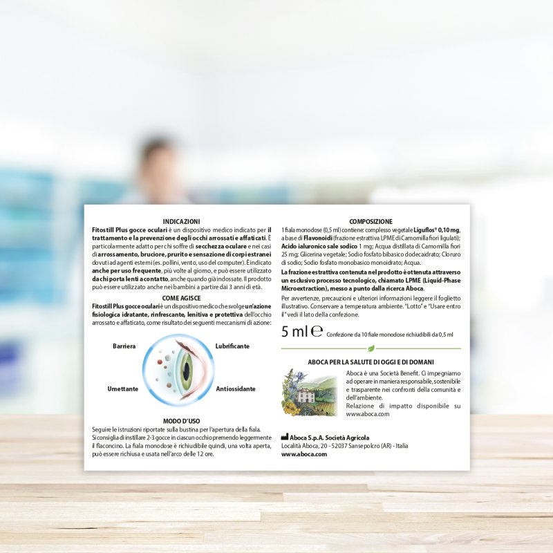 Fitostill Plus gocce oculari è confezionato in pratiche fiale monodose sterili, senza l’utilizzo di conservanti e coloranti. Una leggera colorazione è dovuta alla componente vegetale del Liguflos.