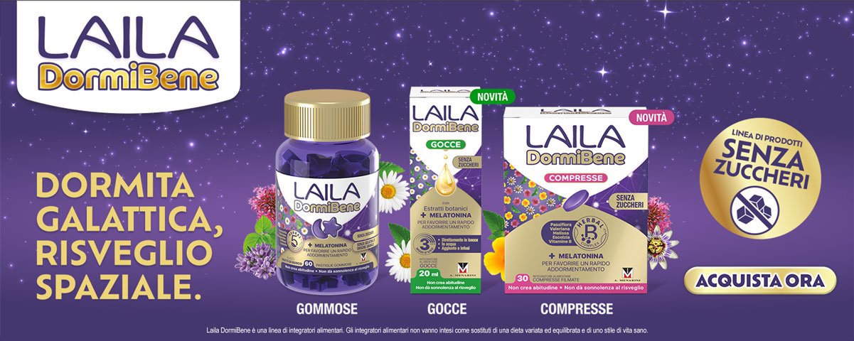 Laila Dormibene è l'integratore che libera la mente da ansie e preoccupazioni, regalando notti tranquille e rigeneranti. Senza glutine e senza lattosio, è perfetto anche per le persone celiache.